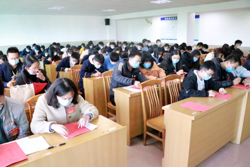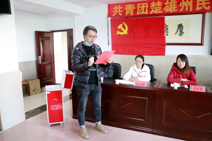 大会选举环节,工作人员宣读《共青团楚雄州民族中学第六次团员代表大会团委委员换届选举办法(草案)》,宣布委员名额和候选人建议名单,介绍候选人基本情况并获得大会一致通过。大会通过杨晓丹老师、何友老师作为监票人,李锡琳老师、李江玲老师作为计票人并完成监票计票工作。