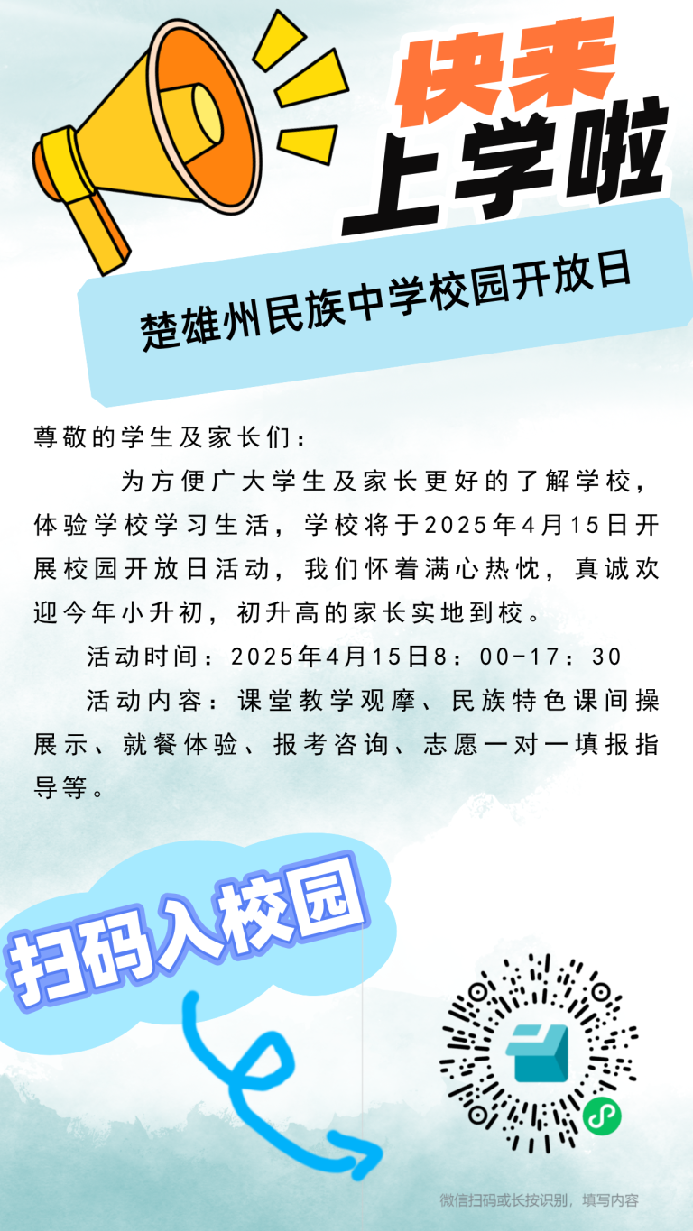 根据楚雄州教育体育局楚教复〔2024〕7号文件批复,我校于2024年开设初中部,2025年学校继续面向全州招收初一新生200名,实行初高中一体化教学。面向全州招收高一新生800名。
