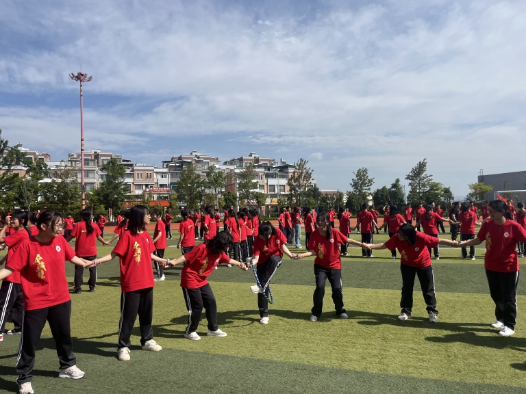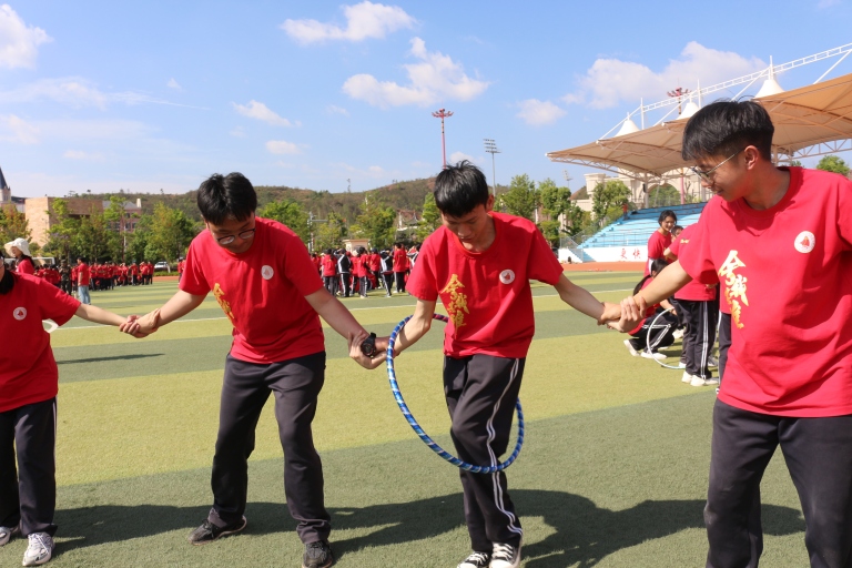 如果说“毛毛虫”项目点燃了激情,“传递呼啦圈”则在轻松中考验着默契。各班队员手拉手站成圆圈,当彩色呼啦圈落下,所有人瞬间屏息凝神——不用言语,仅凭肩颈的起伏、腰肢的摆动,让圆环在肢体间“流动”。阳光穿过指缝,洒在少年们上扬的嘴角,这一刻,备考的疲惫化作了眼底的星光,压力在欢声笑语中悄然消融。