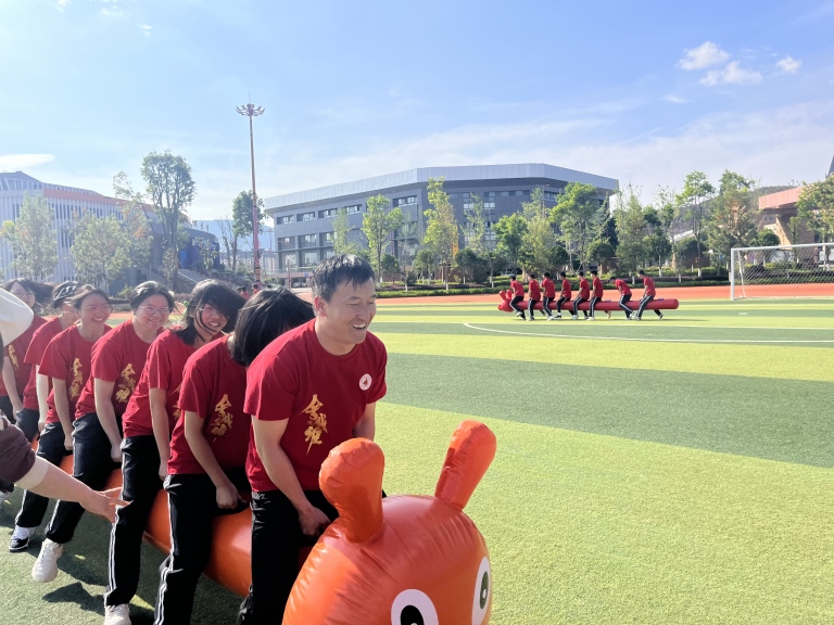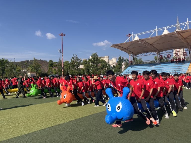 “预备——出发!”随着一声令下,“大战毛毛虫”项目正式拉开帷幕。各班队伍跨坐在色彩鲜艳的充气道具上,宛如驾驭巨型战宠的勇士。“左右左!左右左!”整齐的口号声响彻校园,队员们肩并着肩、手攥着绳,在跑道上奋勇冲刺。摔倒了,迅速爬起重整旗鼓;落后了,彼此喊着“加油”加速追赶。当第一支队伍冲过终点线时,全场爆发出雷鸣般的掌声——这不仅是速度的较量,更是团队精神的胜利,让同学们在呐喊中明白:前行路上,你从不是一个人!