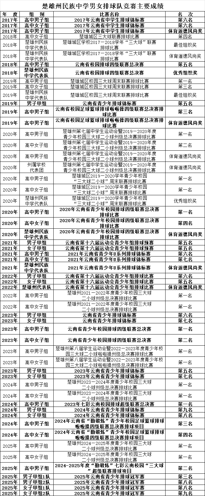 楚雄州民族中学紧跟体教融合发展的步伐,体教融合发展成效明显。学校于2020年被教育部认定为全国青少年校园排球体育传统特色学校。自2017年建队以来,代表楚雄州参加省级排球赛事并多次获得云南省校园排球比赛冠军,我校男子排球队在刚结束的首届“七彩云南”校园三大球超级联赛排球项目荣获高中组冠军,成绩斐然,学校共培养出国家一级运动员33人,国家二级运动员63人。其中获得运动员等级证的同学,可以报考高校高水平运动队及体育单招考试。