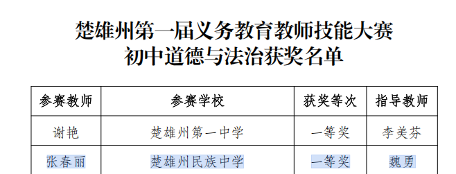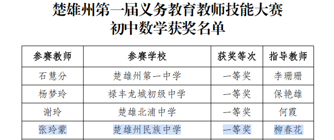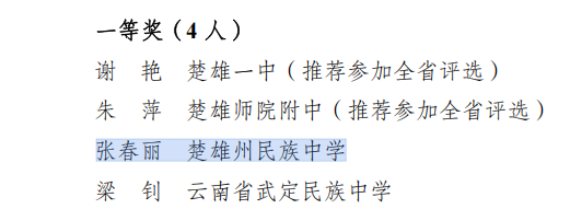 金秋九月,捷报频传!在近期楚雄州教育体育局公布的2025年多项重要教学竞赛评选结果中,楚雄州民族中学教师凭借扎实的专业素养、精湛的教学技艺和先进的教育理念,在激烈的竞争中脱颖而出,喜获多项殊荣,充分展现了我校教师队伍的整体实力和育人风采。