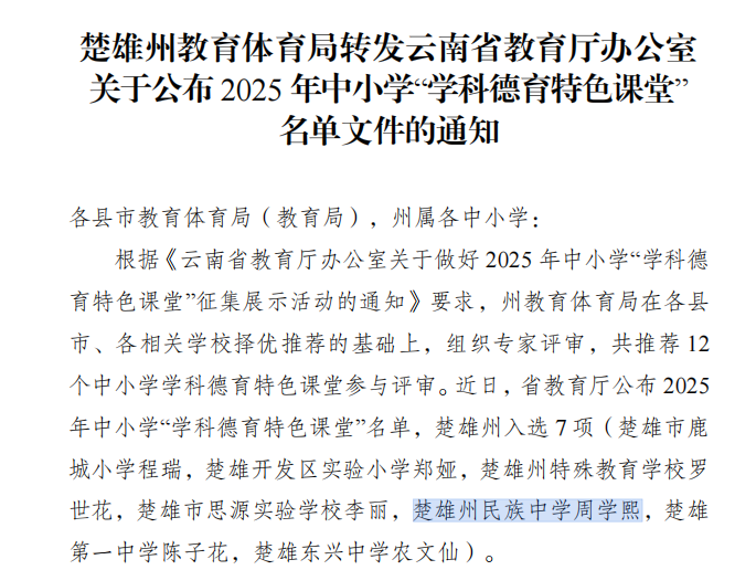 我校周学熙老师的课堂入选2025年云南省"学科德育特色课堂"名单,这一省级荣誉不仅是对周老师深耕德育、创新教学的充分肯定,更彰显我校在"课程思政"改革中的引领地位,为全州学科德育实践树立了标杆典范!