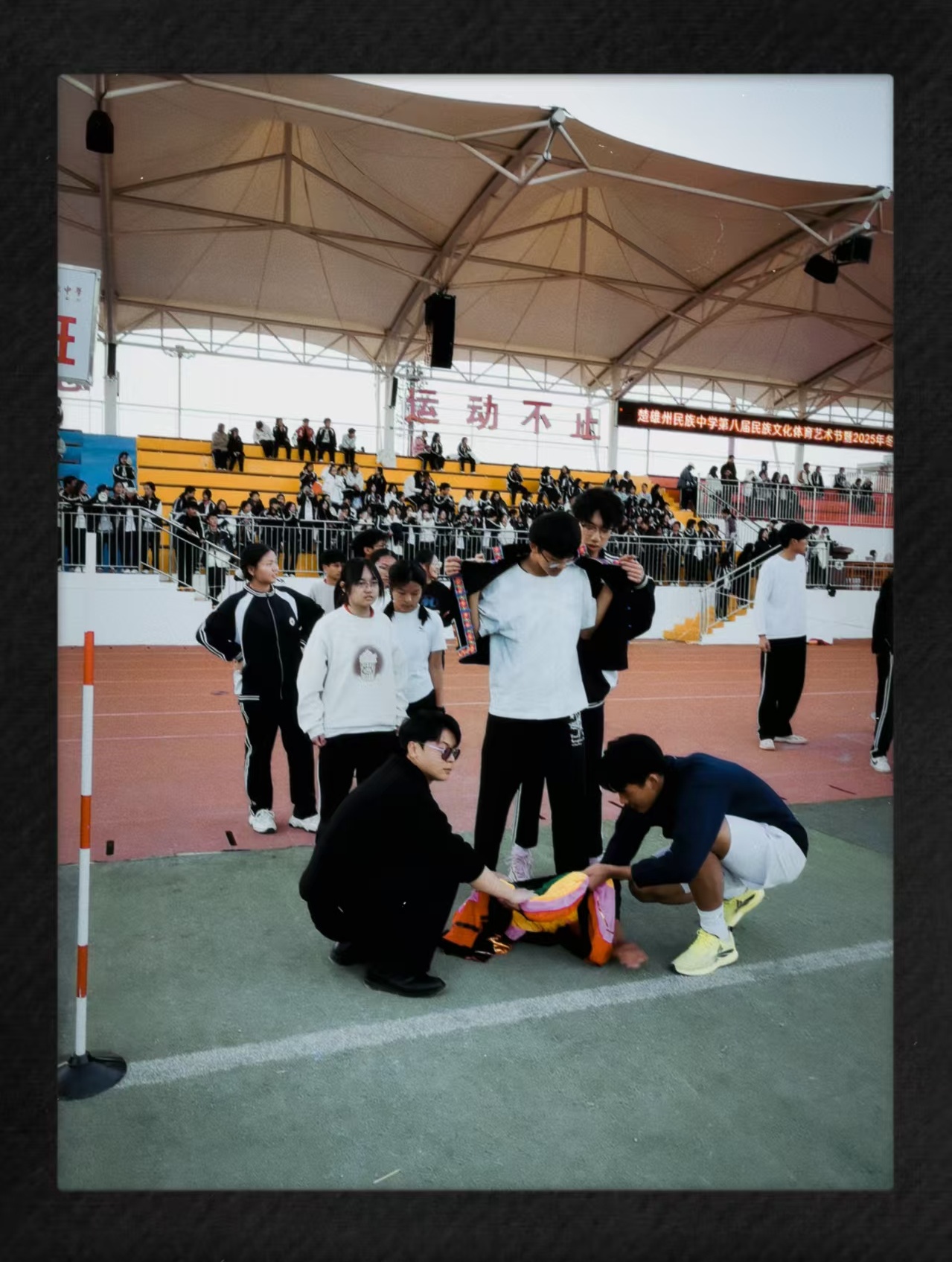赛场外亦有暖景。服务周到的志愿者穿梭赛场,递水擦汗、整理器材;老师裁判严阵以待,守护安全;后勤组同学备好补给,筑牢后盾。赛场上的争先与赛场下的互助,绘就民中最温暖的青春图景。