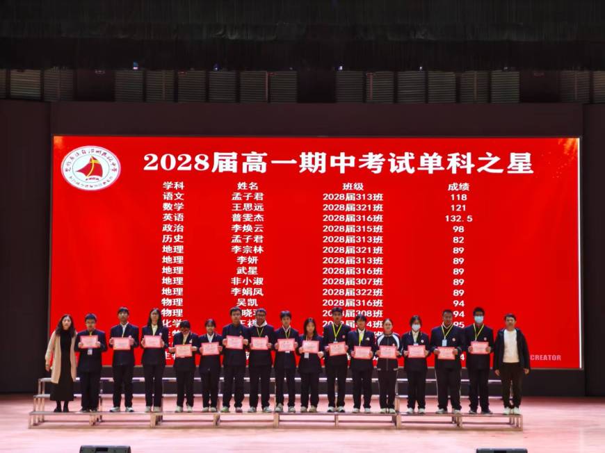 现场掌声尚未散去,学生各类荣誉奖项的颁发紧随其后。高一年级主任尹艳红老师、高一年级党支部书记李加金老师以及全体班主任为获奖学子送上肯定与鼓励。无论是以优异成绩领跑年级的领航之星、单科之星,稳步进阶的卓越之星、精英之星,实现自我突破的锐进之星,还是坚守责任的优秀班干部、品德标杆的德育之星,都在这一刻收获了属于自己的荣光,成为校园里最耀眼的成长榜样。