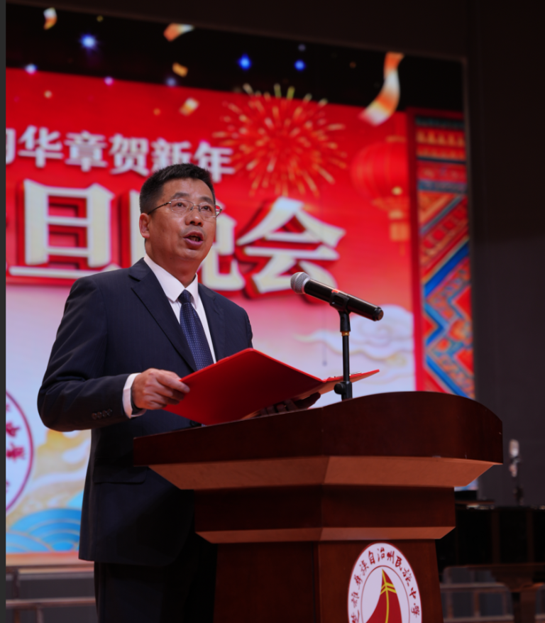 伴随雄壮激昂的国歌旋律,全体人员肃立高歌,晚会正式拉开帷幕。随后,刘明知校长发表新年致辞。他向辛勤耕耘在教育教学一线的全体教职工致以最诚挚的感谢,向勤奋笃学、锐意进取的同学们送上最美好的新年祝福。致辞中,刘校长系统回顾了2025年学校在党建引领、教学改革、育人实践等领域取得的亮眼成绩,同时客观指出当前学校在发展进程中面临的挑战与不足,为新一年的奋斗方向锚定坐标。