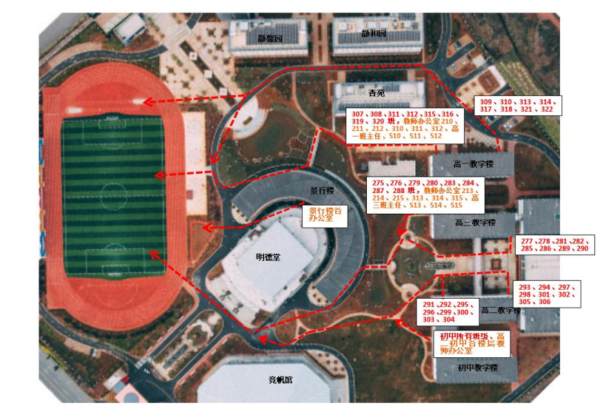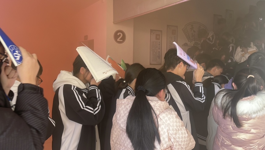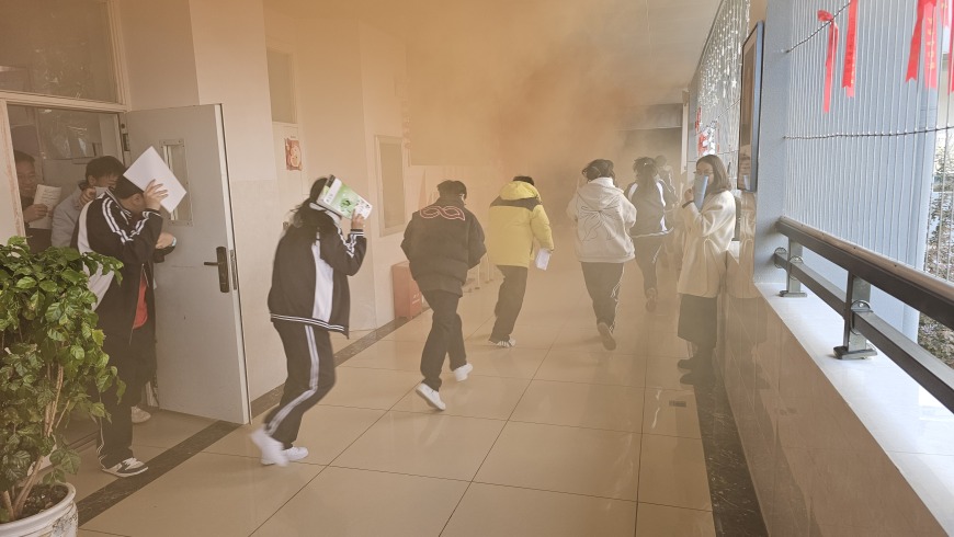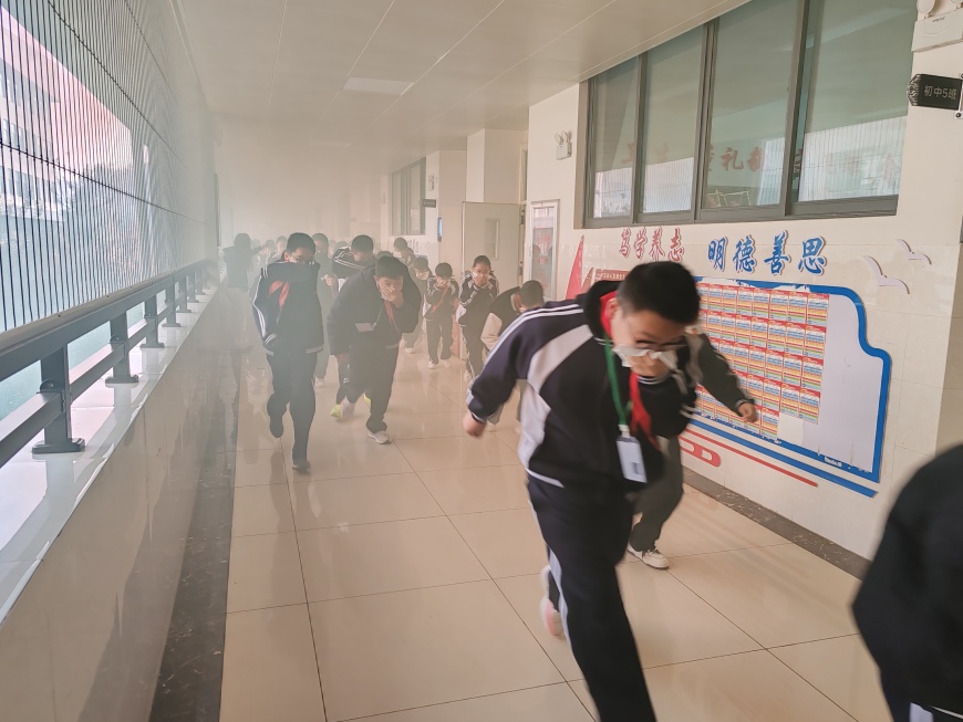 疏散指令发出后,全校师生迅速进入疏散状态。各班学生在老师的引导下,弯腰低姿、捂住口鼻,严格按照预定疏散路线,快速、有序地从各教学楼向足球场安全区域撤离。整个疏散过程全员配合默契、秩序井然,无拥挤、推搡、踩踏等情况发生,仅用 4分12秒,全校师生全部完成安全集结。